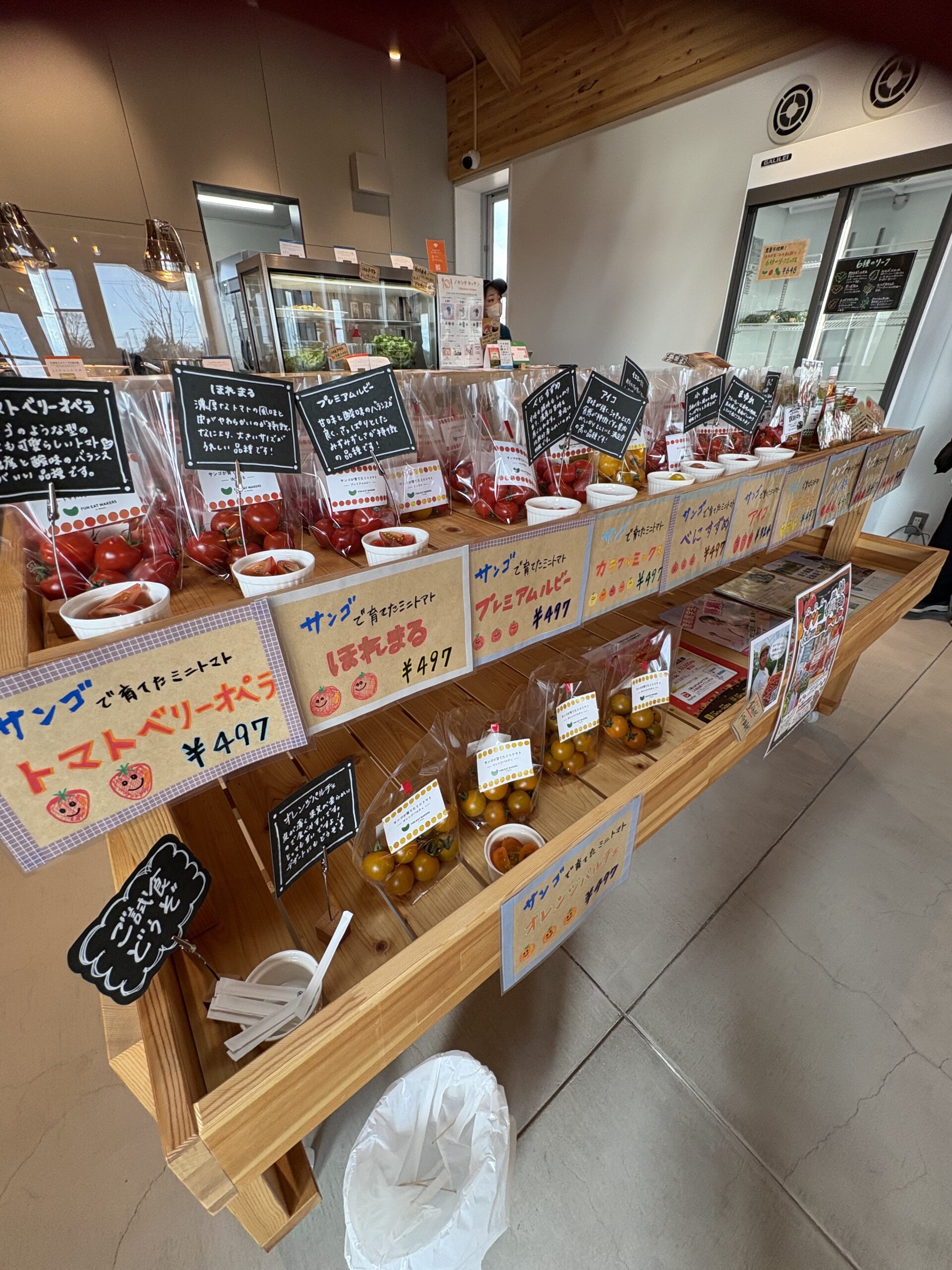 レストラン横には、地元農家の方が育てたミニトマトを中心に、新鮮な野菜を販売するマルシェコーナーがあります。