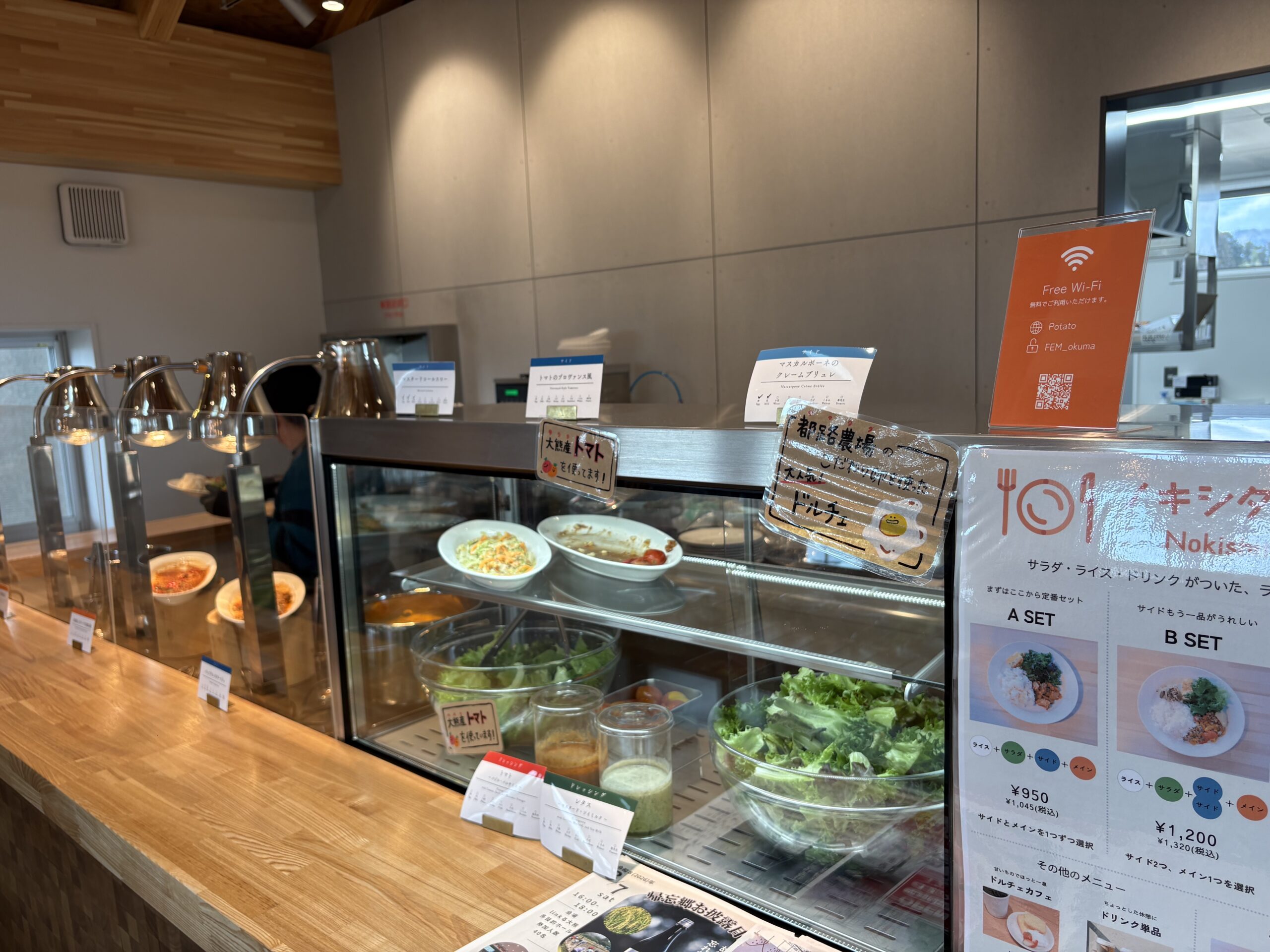 セルフ形式のカウンターには、メイン料理やサラダ、スープが整然と並び、好みのセットを選ぶことができます。